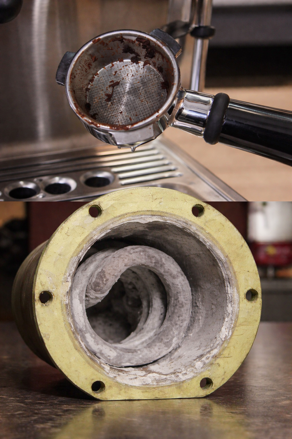 The mineral buildup and coffee oil residue are the problem.